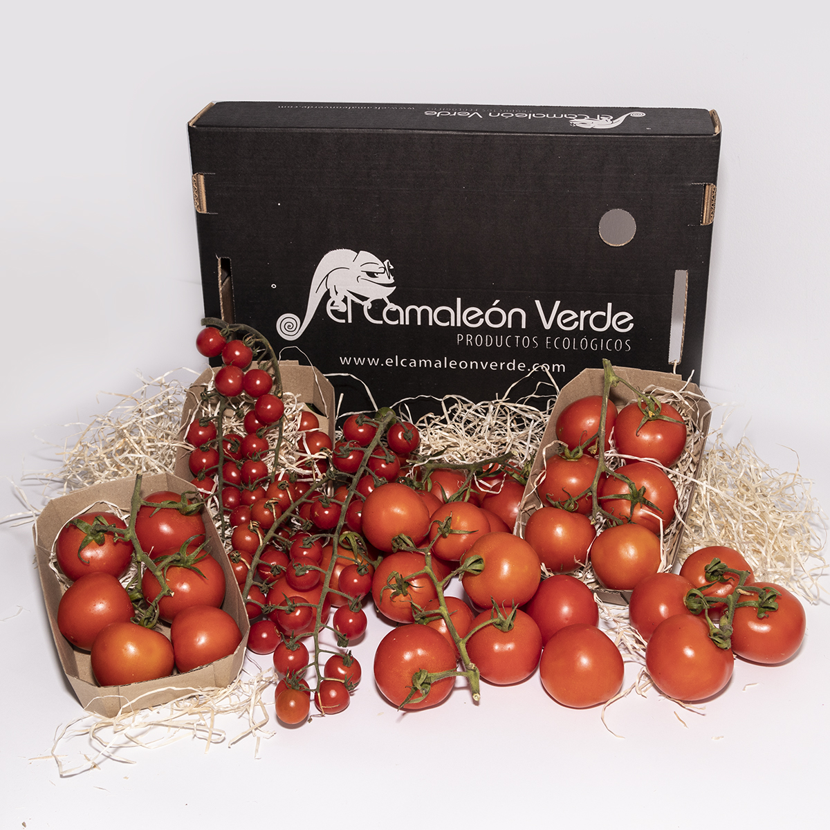 En El Camaleón Verde puedes comprar una cesta de tomates ecológicos en la que encontrarás las variedades de tomate ecológico en rama y de tomate cherry.
